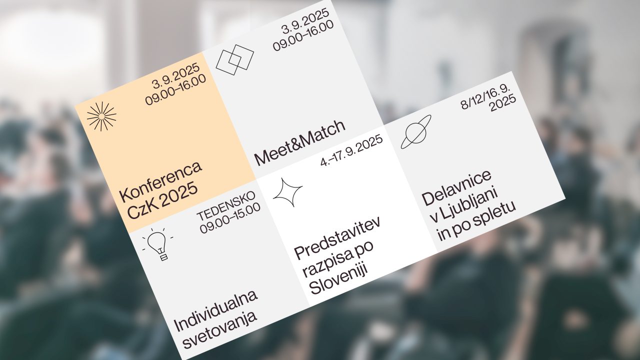 V okviru napovedane objave javnega razpisa »Spodbujanje kulturnih in kreativnih industrij – Center za kreativnost 2025«, ki ga bo Ministrstvo za kulturo objavilo sredi avgusta 2025, vabimo k vključitvi v programe aktivnosti za prijavitelje. Razpis bo predvidoma odprt do druge polovice septembra, njegova skupna vrednost pa znaša 2.028.124,37 evra. Programi so namenjeni celostni pripravi kakovostnih projektnih predlogov in uspešni prijavi.