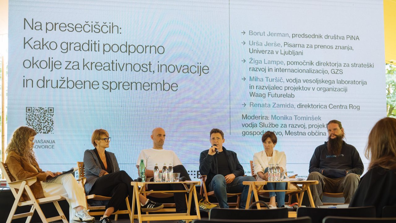 Druga okrogla miza, Na presečiščih: Kako graditi podporno okolje za kreativnost, inovacije in družbene spremembe, je združila slovenske ustvarjalce in strokovnjake, ki gradijo okolja za družbene in tehnološke inovacije. Poudarili so pomen medsebojnih povezav in dodane vrednosti kreativnega sektorja pri inovacijah ter različne oblike sodelovanja. Sodelovali so Borut Jerman, Urša Jerše, Žiga Lampe, Miha Turšič in Renata Zamida, moderirala pa Monika Tominšek.