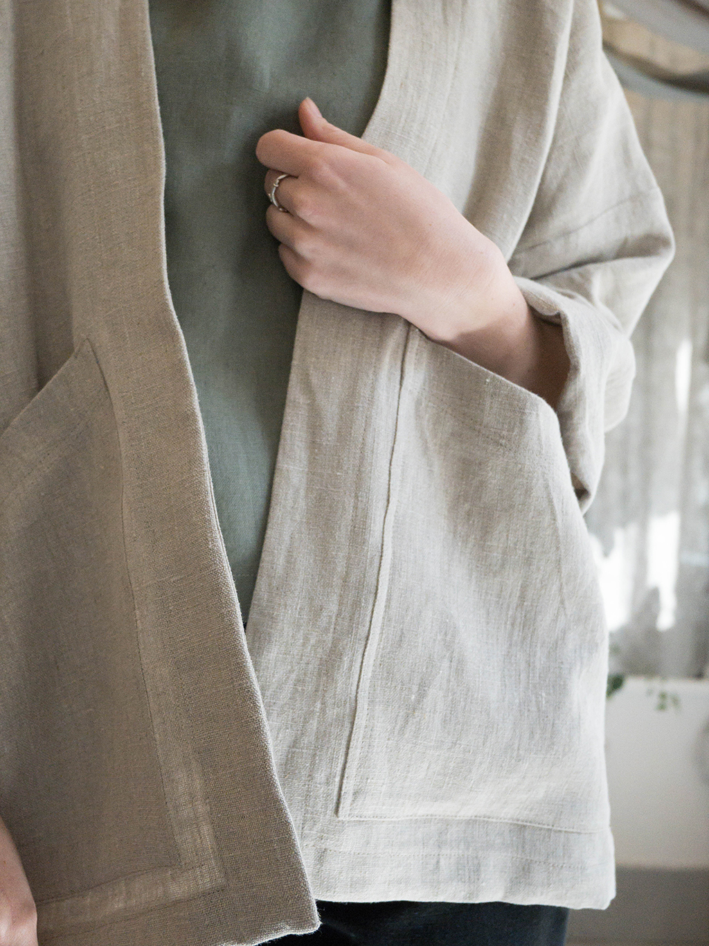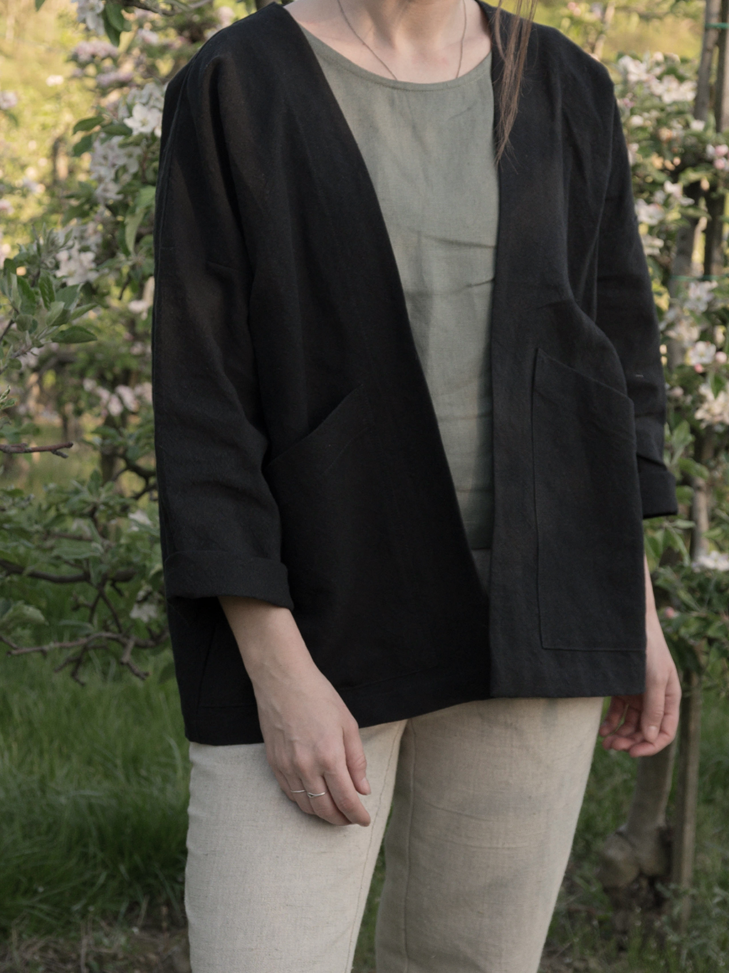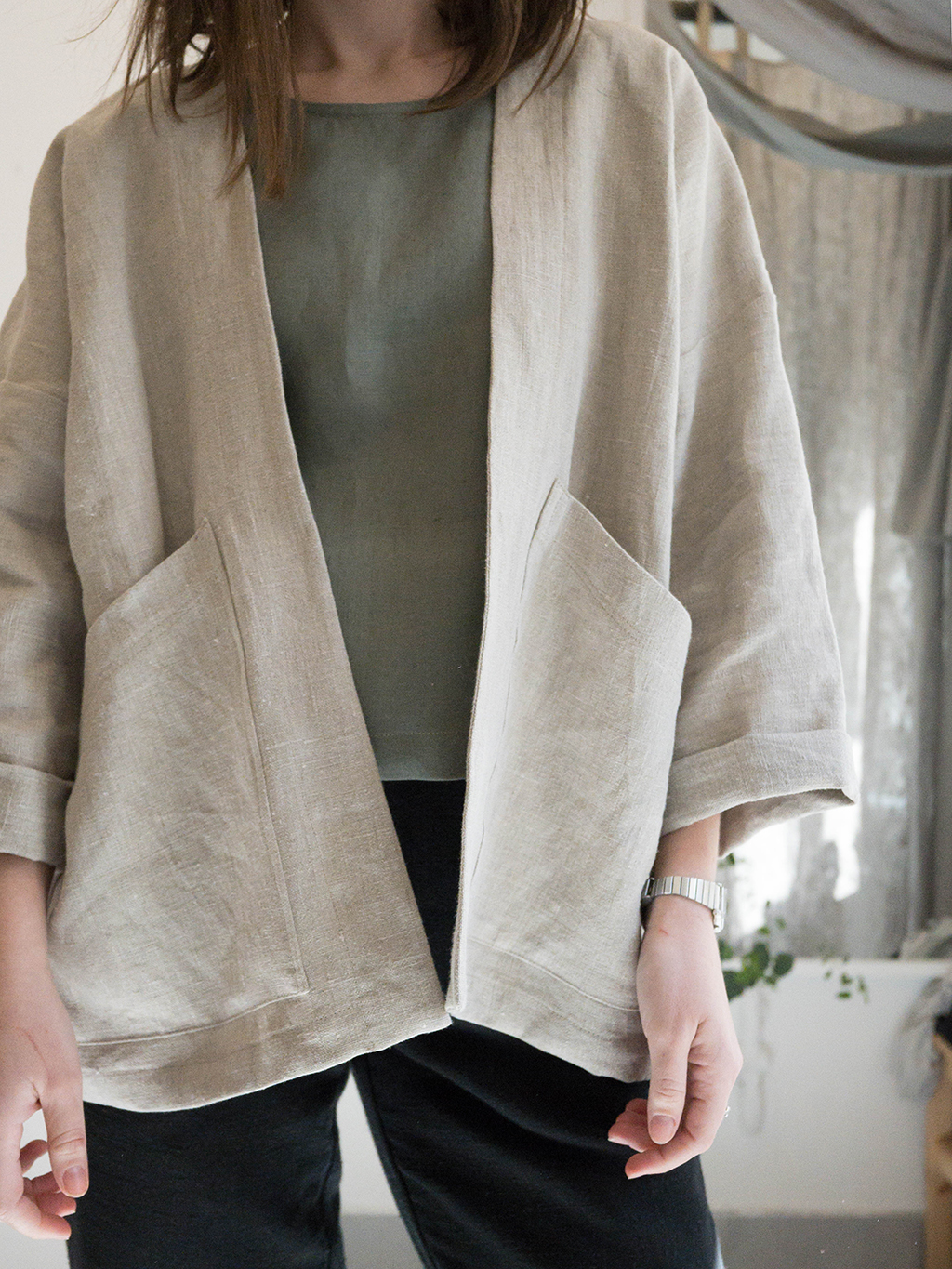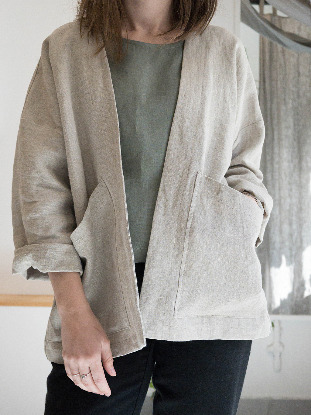 Prefinjena kimono jakna iz certificiranega lana združuje trajnost, udobje in brezčasno eleganco sodobne ženske garderobe