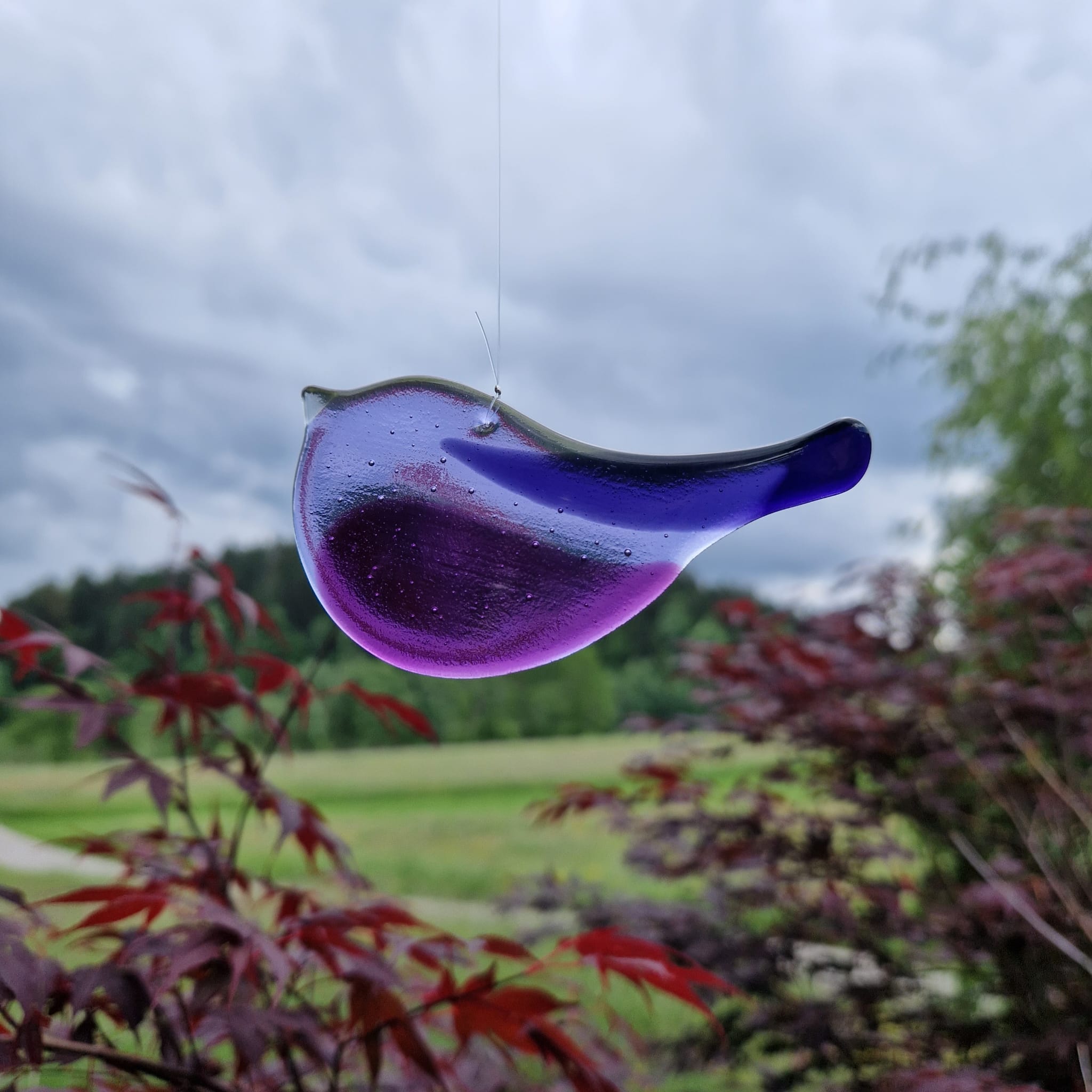 Barvit ptiček iz taljenega stekla - lovilec sončnih žarkov. Opremljen z najlonsko vrvico za obešanje.