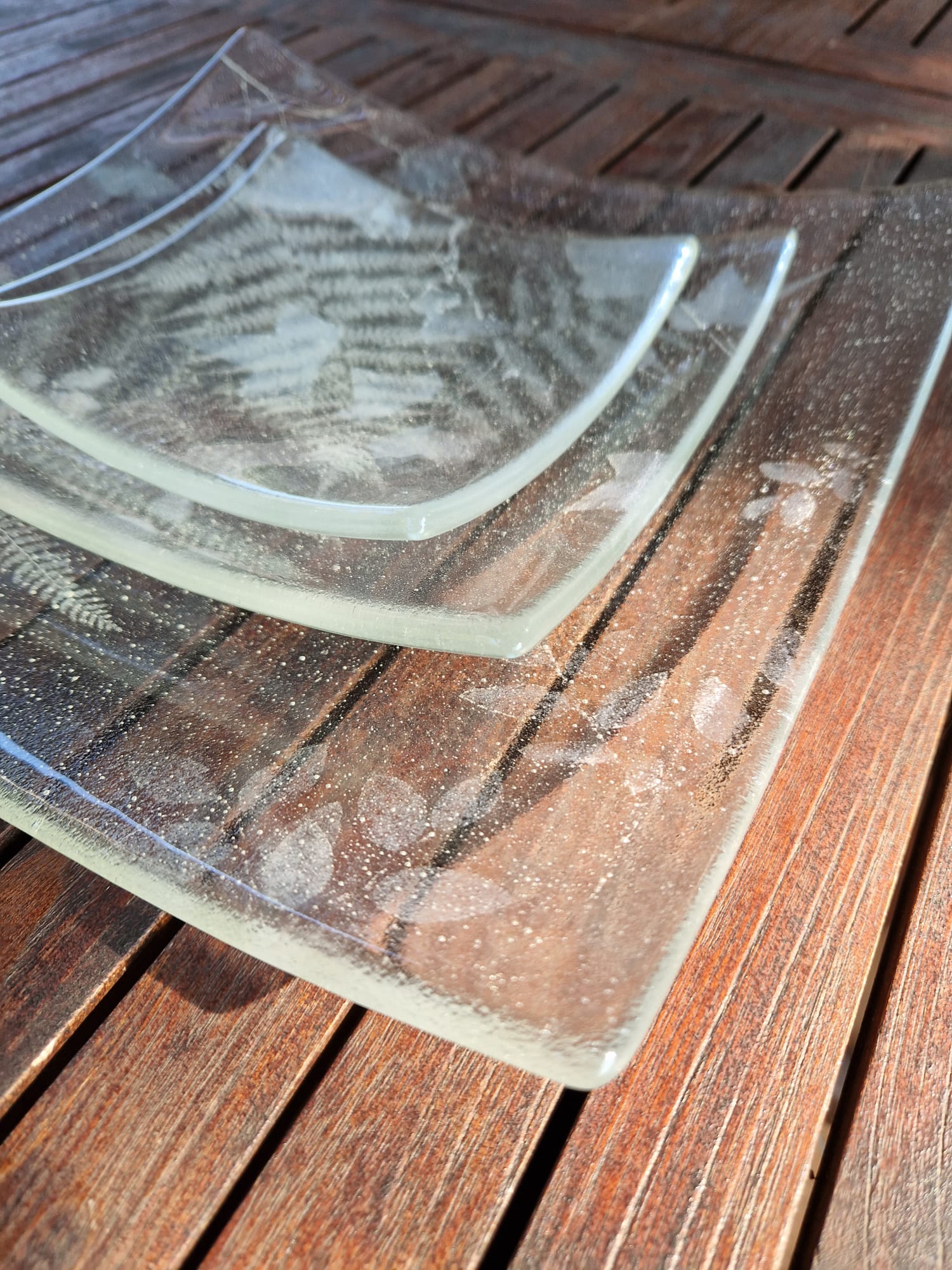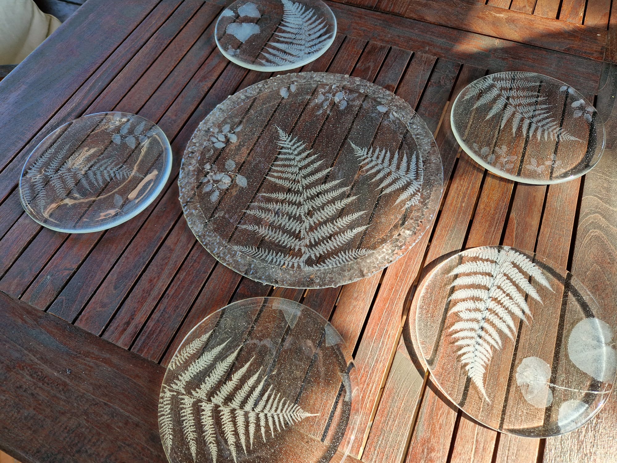 Unikatni krožniki iz taljenega stekla. Vanje je ujeto pravo gozdno rastje, žgano v tehniki fuzije - fossil vitra.
