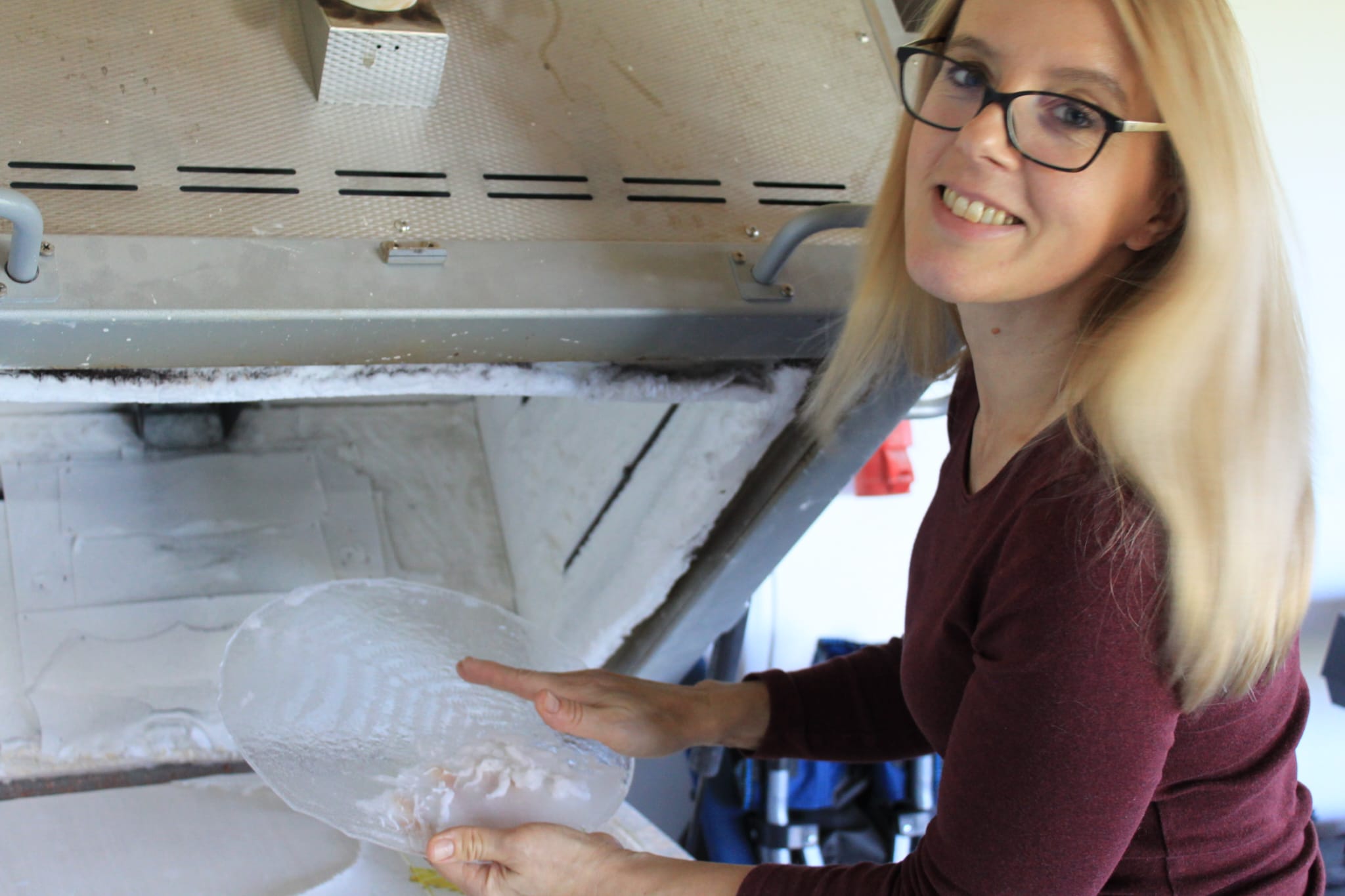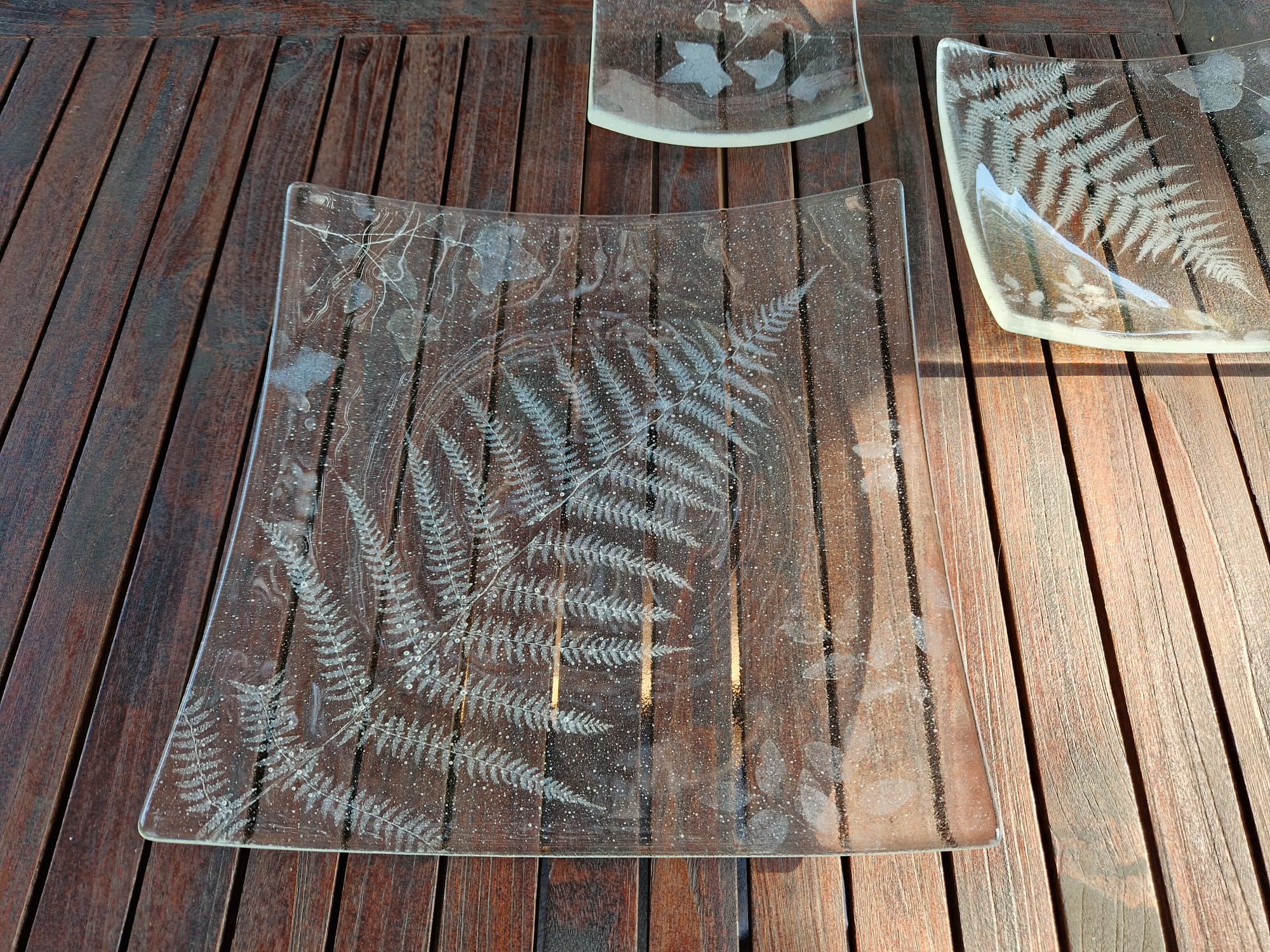 Izdelava poteka v treh fazah: najprej pripravim rastlino in jo žgem z eno plastjo stekla. Druga faza je brušenje, čiščenje in drugo žganje, kjer dodam še eno plast stekla, da zaščitim rastlinsko ostalino in je krožnik primeren za hrano. Tretja faza je upogibanje stekla po unikatnem kalupu, ki ga izdelam sama.